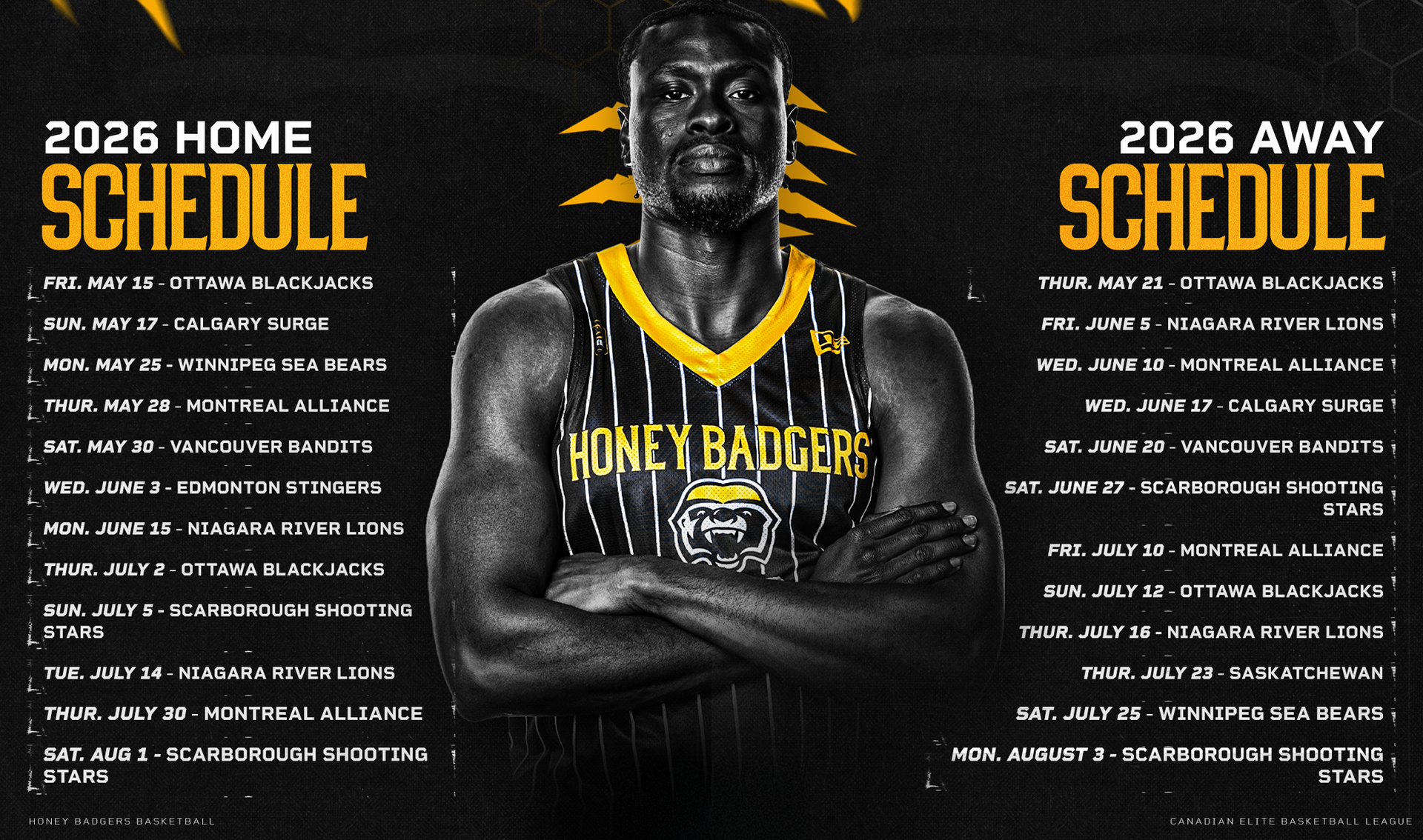 January 15, 2026 – Brampton, ON – The Brampton Honey Badgers and the Canadian Elite Basketball League (CEBL) have unveiled the 2026 season schedule Thursday as the organization and league march forward into their eighth season, which will feature a brand new playoff format. This season marks the first under the Brampton Honey Badgers “new era”, which features a new cast of prominent leadership figures, including CEO Al Whitley who has 22 years of NBA experience with the Dallas Mavericks, working very closely with Mark Cuban. This new team also includes: President Saud Juman, who was the founder of Policy Medical and more recently won the 2025 CEBL Championship as an assistant coach with the Niagara River Lions; Assistant General Manager John Ross who spent 14 seasons with the Portland Trail Blazers in their scouting department; and Director of Revenue Generation Blake Duffy, who spent eight years working up the ranks of Ottawa Sports & Entertainment Group (OSEG). The Honey Badgers’s season will officially tip off with a two-game homestand beginning on Friday, May 15 at the CAA Centre versus the Ottawa BlackJacks at 7:30 PM ET, followed by a battle against the Calgary Surge on Sunday, May 17 at 4:00 PM ET. The month of May is an active one for the Black & Gold, playing through six of their 24 regular season games between May 15 - May 30, with five of those six taking place at the CAA Centre. After the home opening weekend, the Honey Badgers hit the road for a quick stop in the Nation’s Capital to face the BlackJacks, then return to Brampton for four straight at home. “Schedule release day is always one of the most exciting days of the offseason,” said Honey Badgers CEO Al Whitley. “This is only the first step of our schedule release, as our fans and the community can expect a strong and exciting slate of themes to be announced with all our games soon. 2026 is a NEW ERA in Honey Badgers history, and we are committed to bringing the very best product and entertainment to our fans and partners alike.” With more theme nights to be announced as the season approaches, the Honey Badgers have already locked in their fifth School Day game at the CAA Centre to take place on Thursday, May 28 at 11:00 AM ET, and their third annual City of Brampton Camp Day game taking place on Tuesday, July 14 at 11:00 AM ET. While May is a big month at the CAA Centre, June is a big one on the road. The Honey Badgers will play five of their seven June games on the road, beginning in Niagara on June 5 and Montreal on June 10 before heading out west to visit the Calgary Surge and Vancouver Bandits on June 17 and June 20, respectively. The Honey Badgers will close the regular season with two games against their crosstown rivals, the Scarborough Shooting Stars. Saturday August 1, the Honey Badgers will host their final regular season game while the Shooting Stars will host theirs on Monday, August 3. This season, the CEBL has altered their playoff format and will be debuting the new CEBL Finals. They will begin with single-elimination Conference Semifinals on Thursday, August 6, where the 1st seed faces the 4th seed and the 2nd seed faces the 3rd seed in each conference. Winners will advance to the single-elimination Conference Finals on Saturday, August 8 with higher seeds hosting each round. The CEBL Finals will be a best-of-three series from August 12–16, marking the first multi-game playoff series in league history: Game 1 – August 12 Game 2 – August 15 Game 3 (if necessary) – August 16 The lower seed team will host Game 1, while the higher seed will host Games 2 and 3 (if necessary), replacing the previous single-elimination Championship Weekend host team model. Full Brampton Honey Badgers Regular Season Schedule: